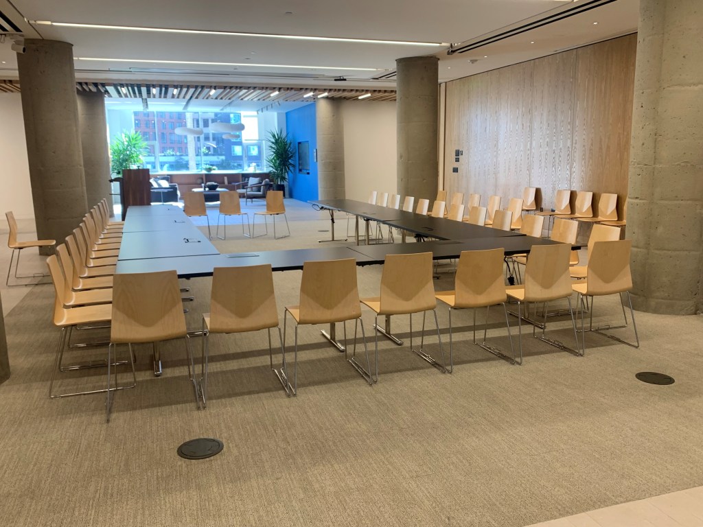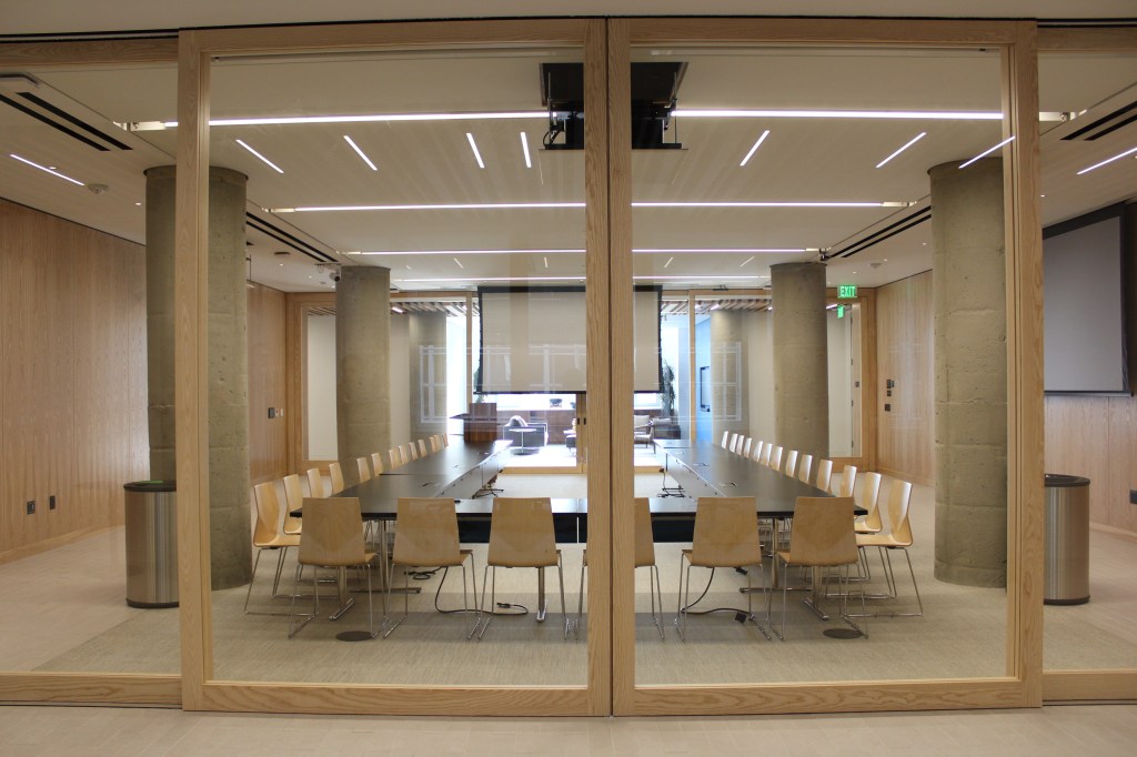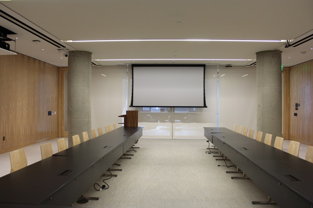 A Crestron audio-visual touch panel is available, providing the presenter with control of the room’s AV systems from anywhere within the space. Wireless handheld and tabletop microphones are also available for use. Additionally, multiple floor outlets throughout the room provide connections for AV, data, and power, supporting a variety of seating and podium arrangements. A raised stage and free-standing podium can be provided upon request.